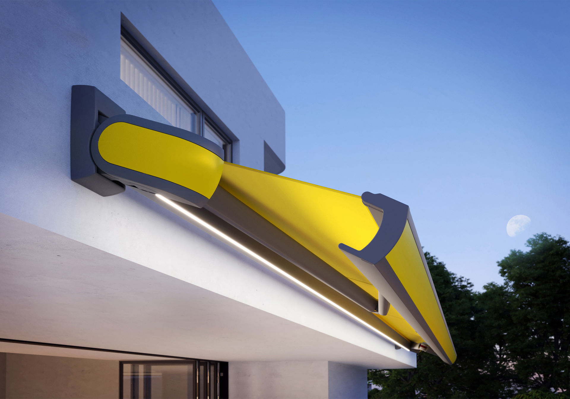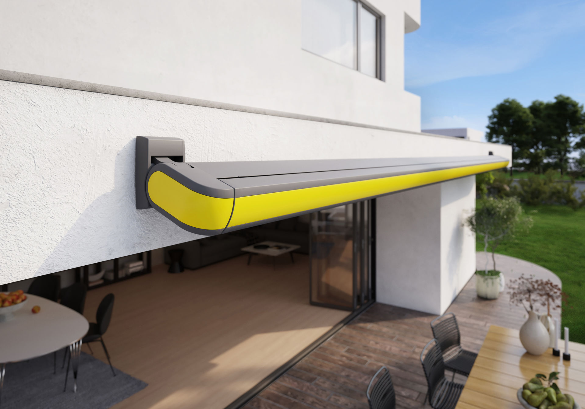 De kunststof front- en zijpanelen geven de mogelijkheid een unieke uitstraling aan het zonnescherm te geven.