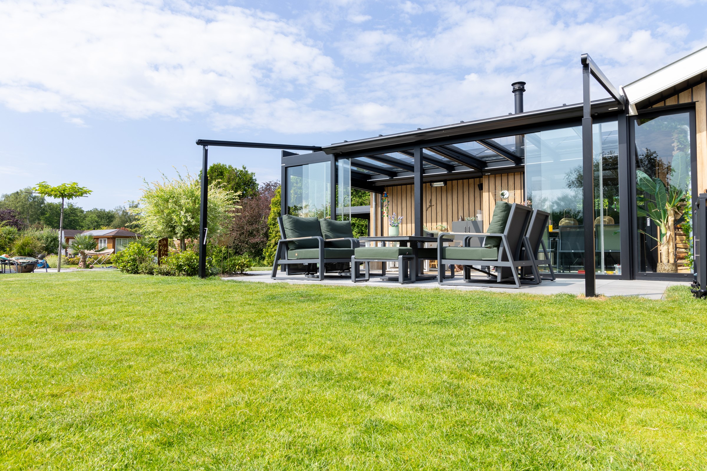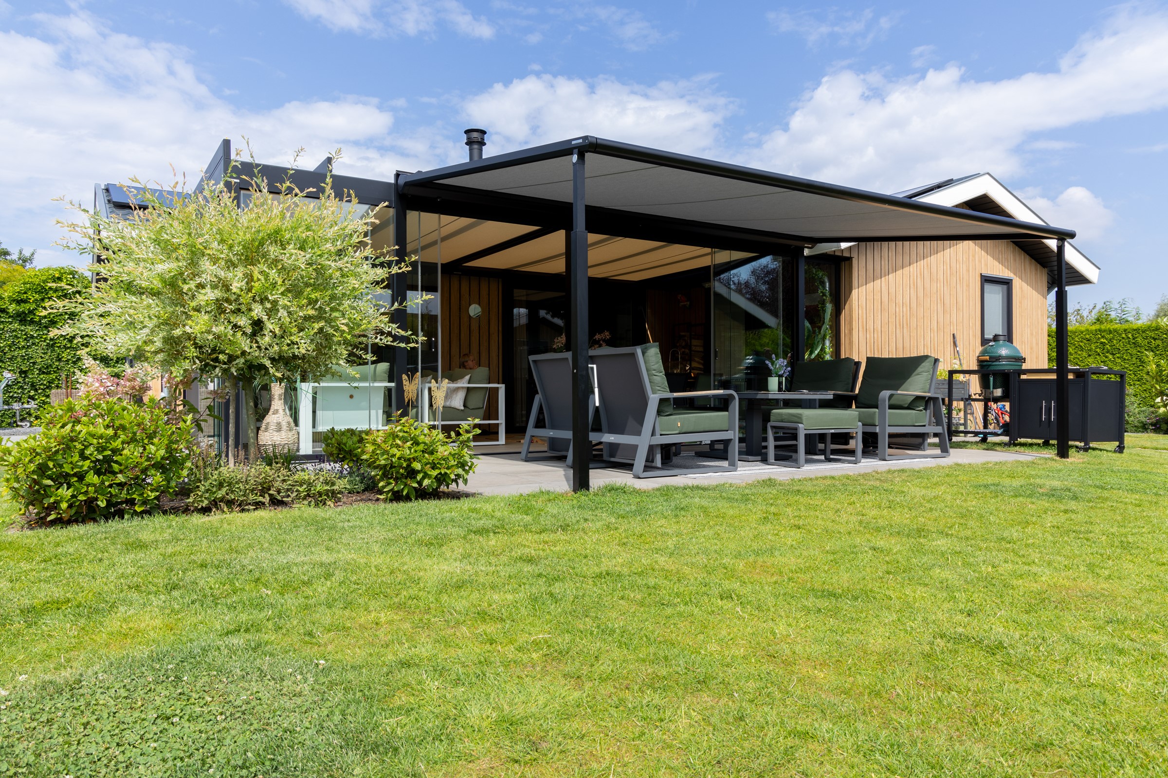 Met deze combinatie van de glasoverkapping, de warmtestralers en de Viva Pergola hebben de bewoners extra leefruimte gecreëerd rondom hun vakantiewoning, waardoor ze in elk seizoen optimaal kunnen genieten van hun tuin en terras, ongeacht de weersomstandigheden.