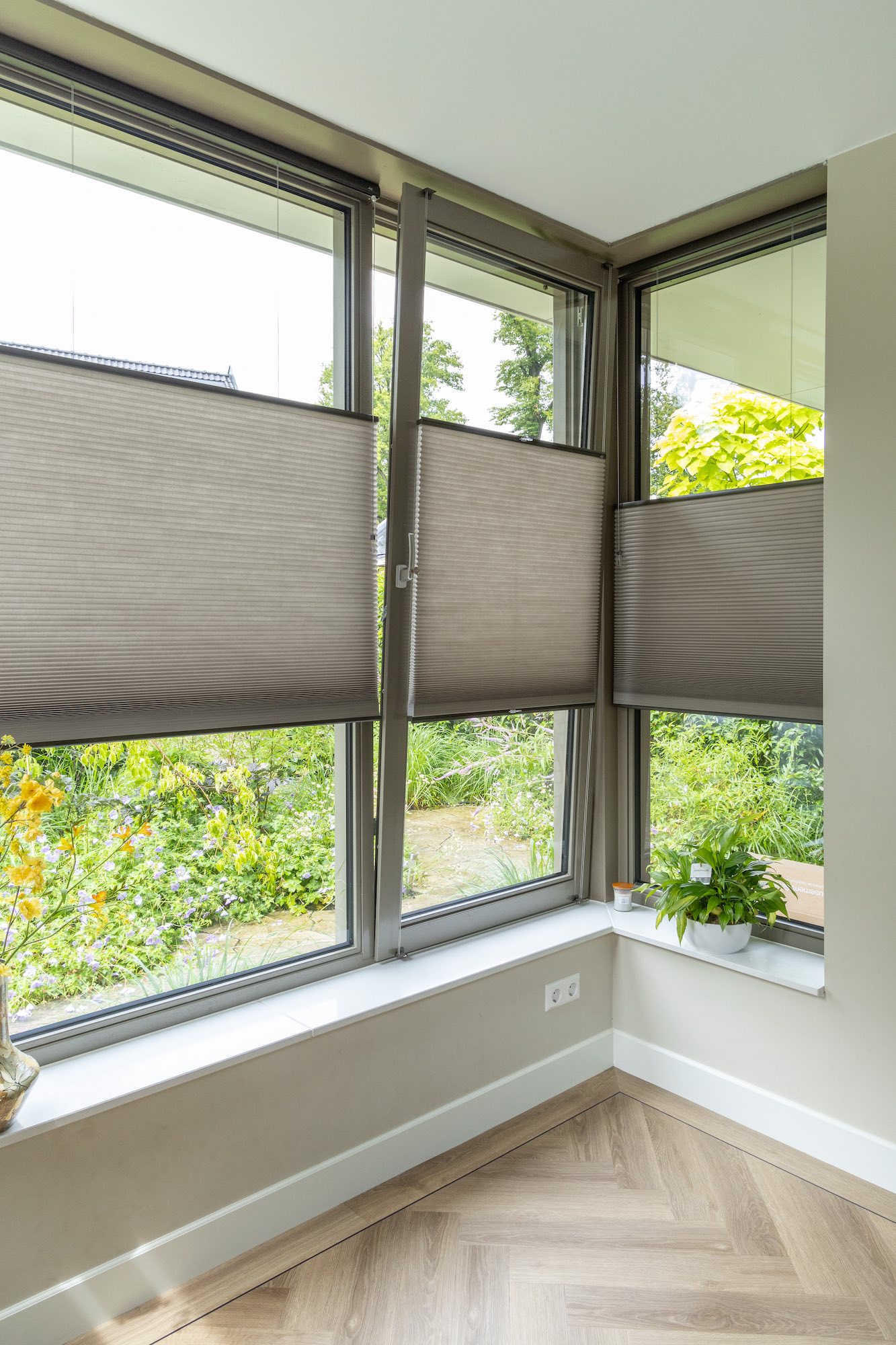 "Een ander groot voordeel van de Duette® Shades is dat ze ook op ons draaikiepraam geplaatst konden worden. Ambiance Van der Wal monteerde een ingespannen Duette® Shade met spanvoeten en spankoorden, direct op het raam. Zo kunnen we het raam makkelijk kantelen of volledig openen zonder dat de shades in de weg zitten. Het raam aankleden zonder ruimteverlies was belangrijk voor ons, en dit systeem werkt perfect!"