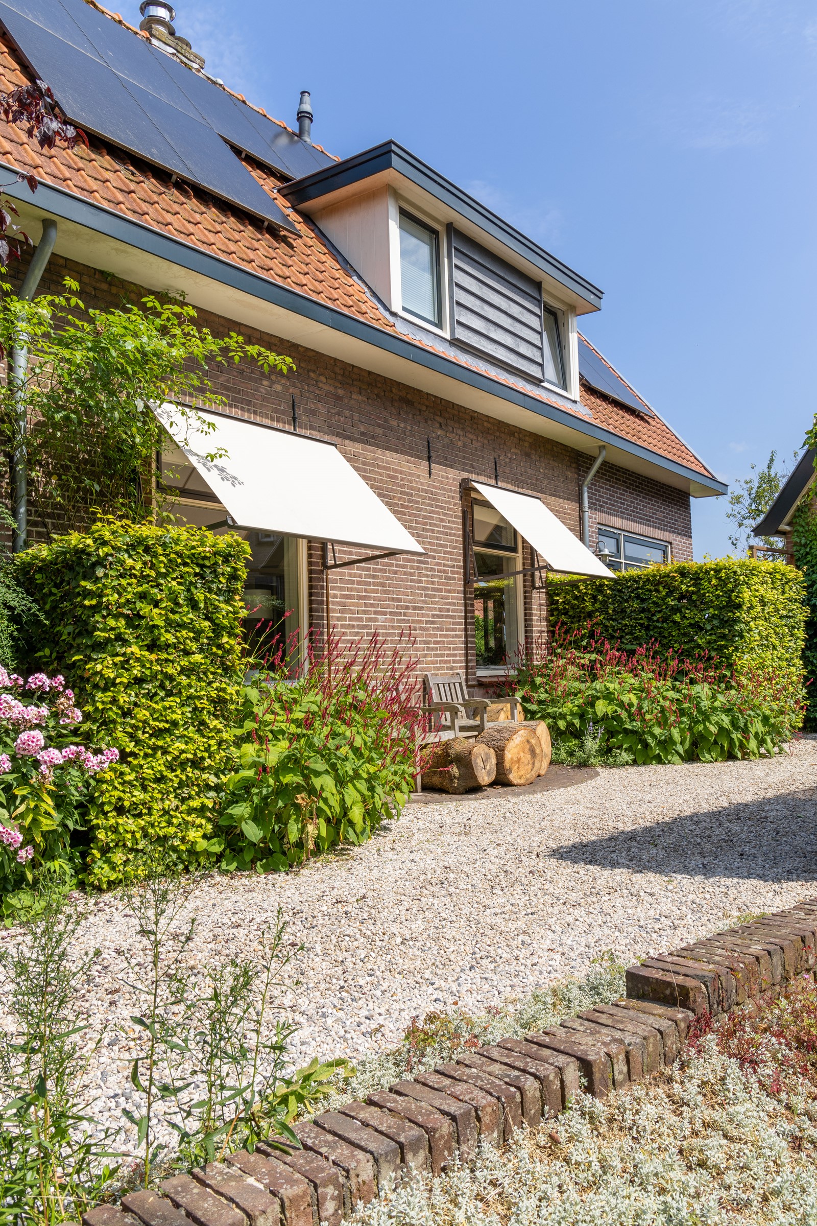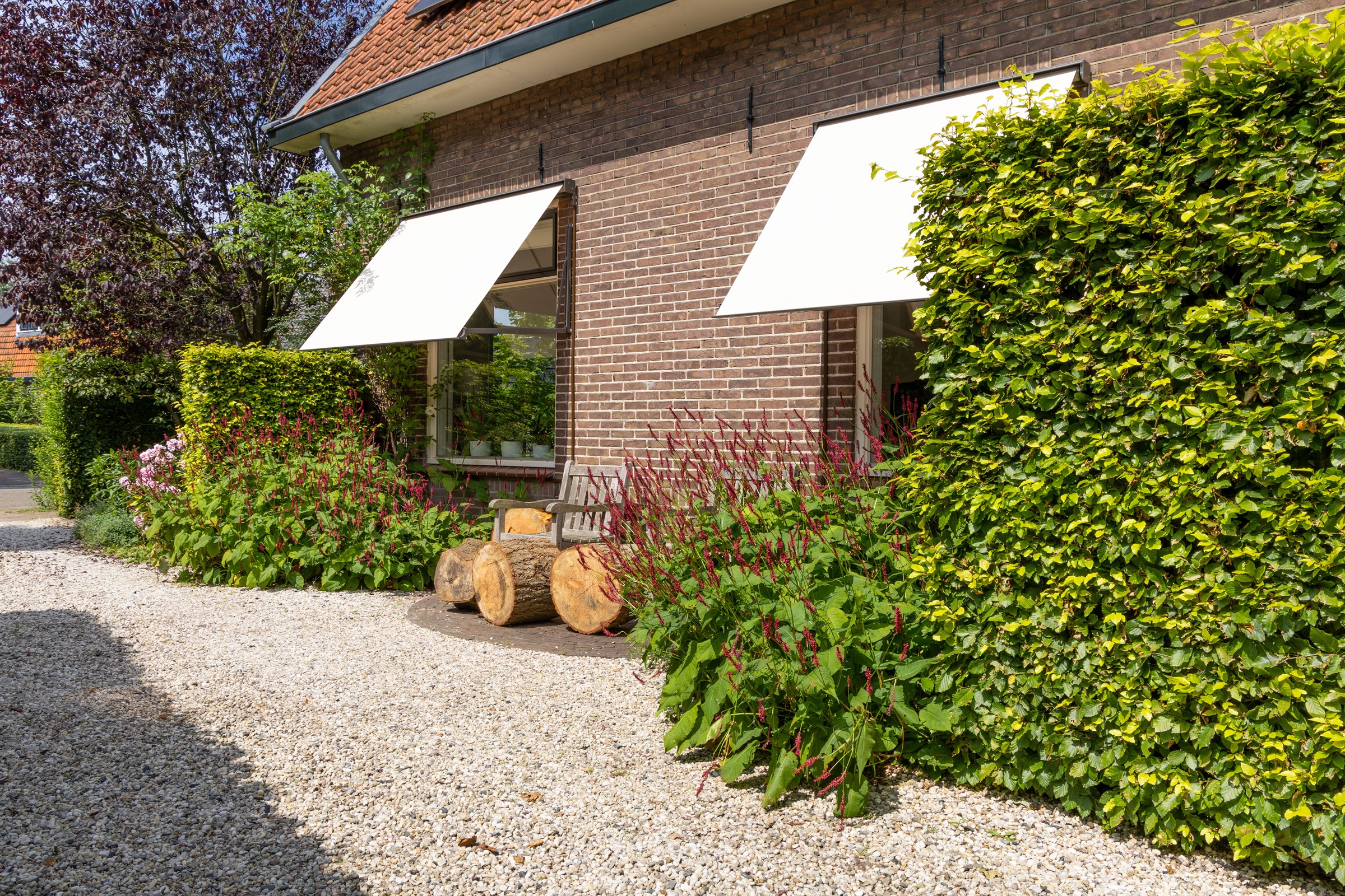 Aan de zijkant van de woning zijn twee uitvalschermen geplaatst. Deze zorgen ervoor dat de zon niet direct naar binnen schijnt, waardoor het binnenklimaat aangenaam blijft. Vooral in de ochtend en avond, wanneer de zon laag staat, bieden uitvalschermen uitstekende bescherming tegen warmte én hinderlijke lichtinval. Ze zijn ideaal voor ramen die niet direct uitzicht nodig hebben, zoals in slaapkamers of woonkamers.
