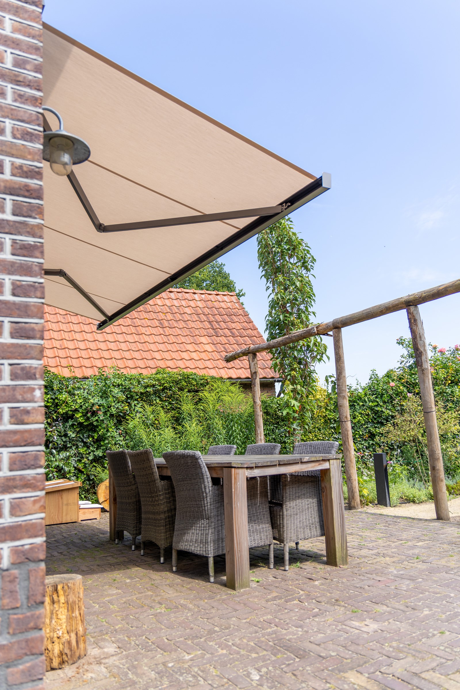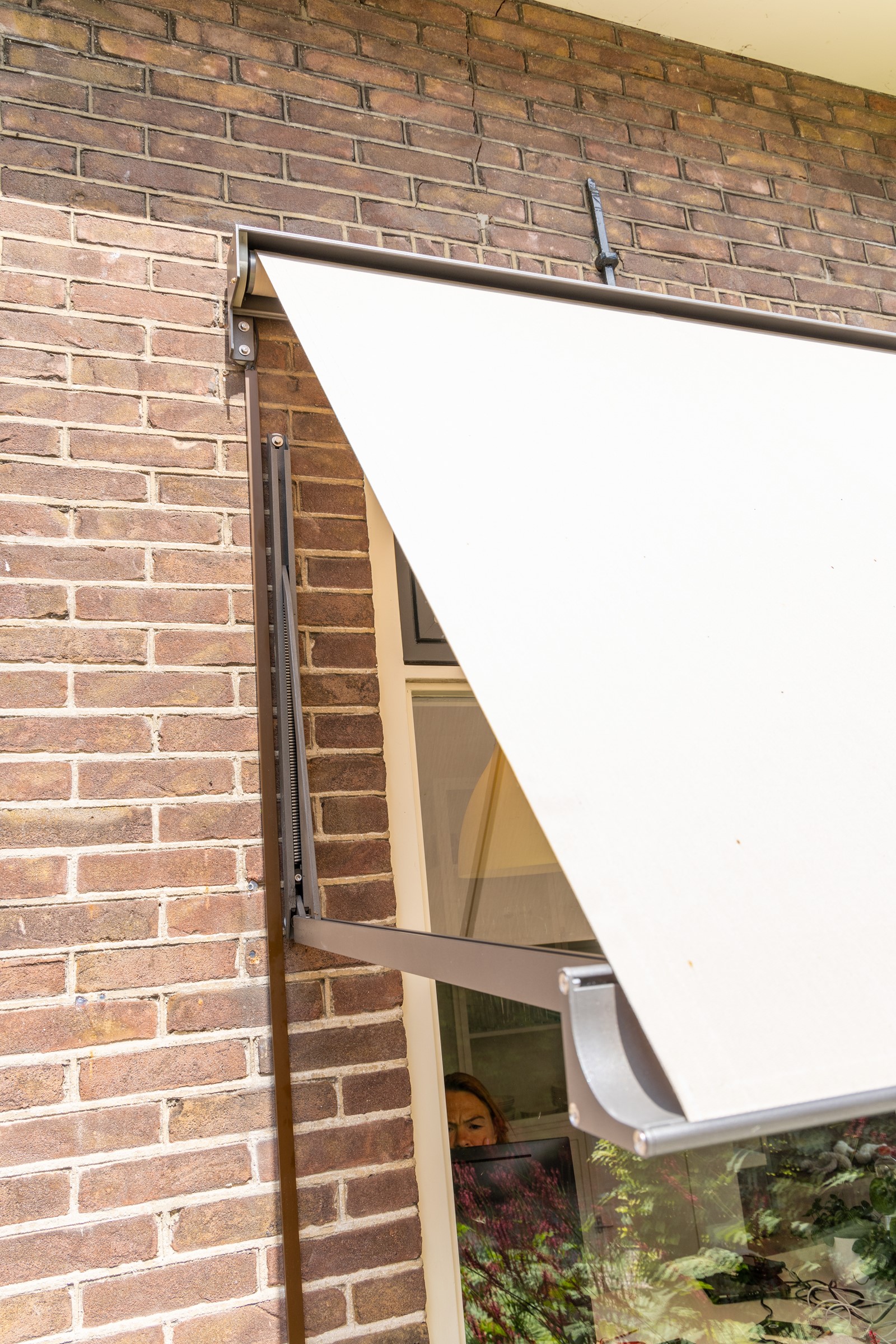 Het geplaatste knikarmscherm is niet alleen elegant, maar ook afgestemd op de leefstijl van de bewoners. Omdat één van de bewoners langer is dan gemiddeld, is ervoor gekozen om het zonnescherm hoger te plaatsen dan gebruikelijk. Hierdoor kan hij zonder hinder onder het doek doorlopen. Dit soort maatwerk laat zien hoe zonwering niet alleen comfort biedt, maar ook volledig kan worden aangepast aan persoonlijke voorkeuren.