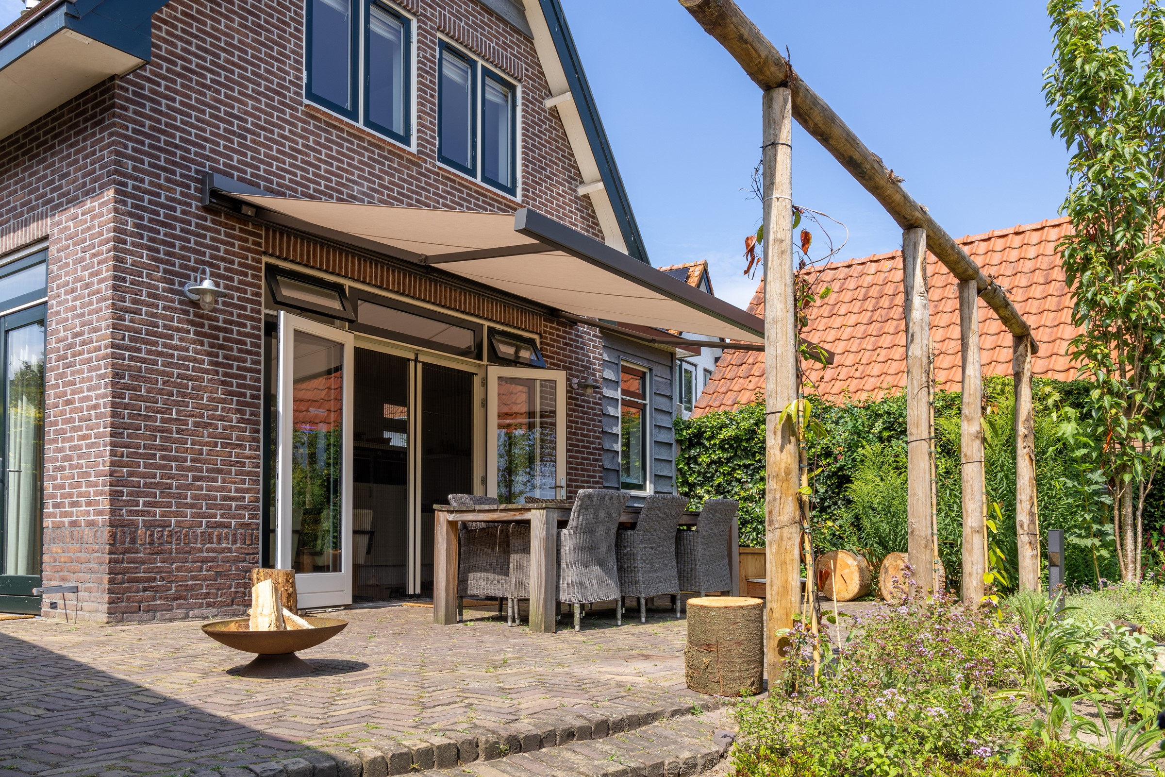 De combinatie van het knikarmscherm en de uitvalschermen zorgt ervoor dat zowel de binnen- als buitenruimte optimaal beschermd is tegen de zon. De woning blijft koeler, het terras comfortabeler, en het geheel oogt strak en verzorgd.