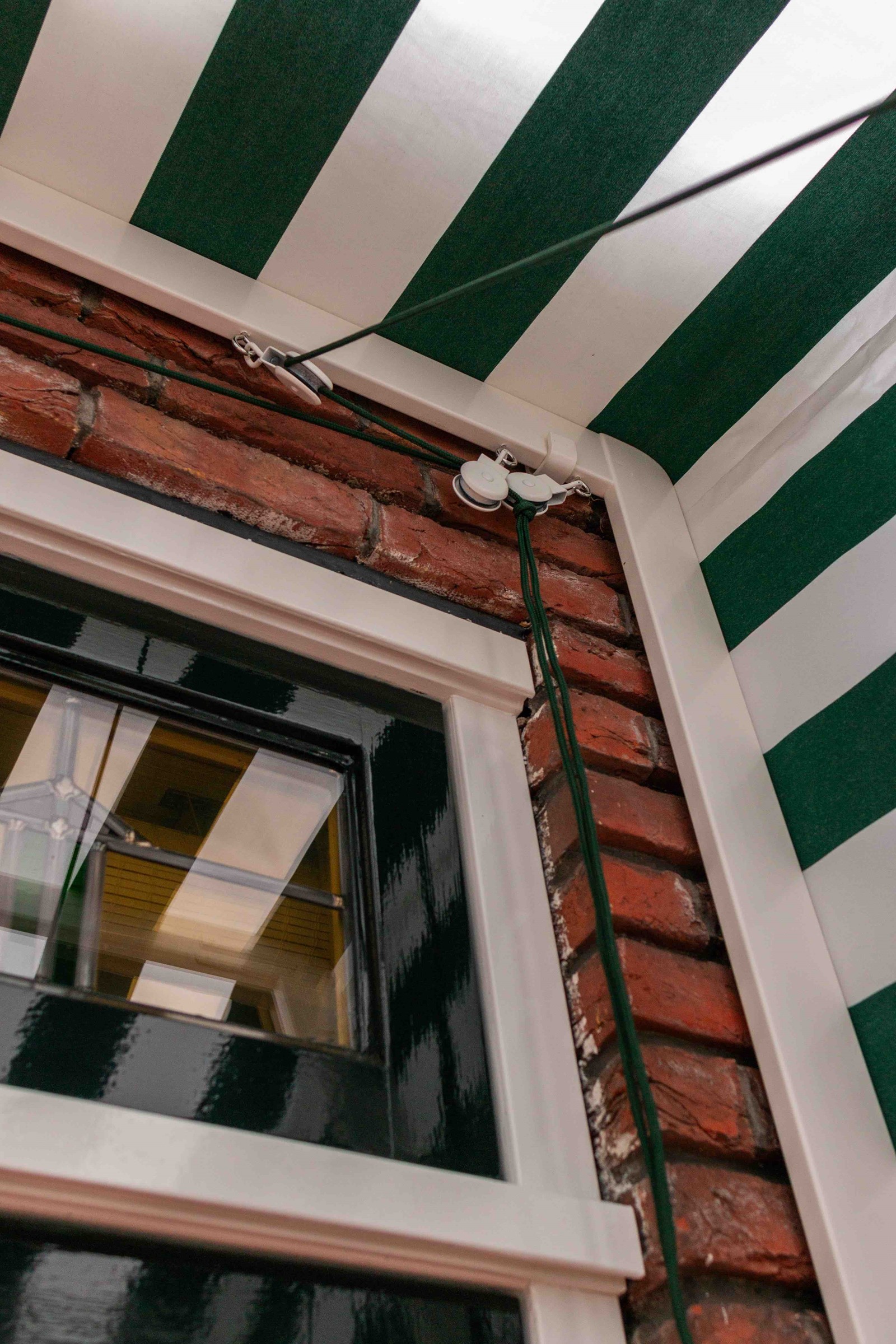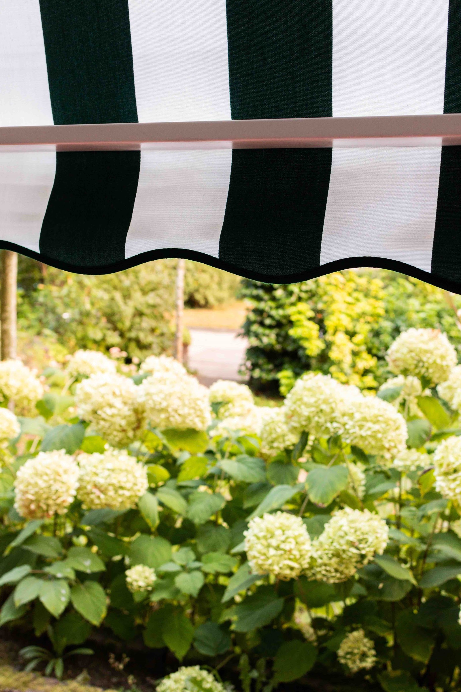 Het frame van de markies is uitgevoerd in hoogwaardig hout, zorgvuldig afgewerkt voor langdurige bescherming tegen weer en wind. De groen-witte strepen van het doek geven het geheel een frisse en klassieke uitstraling die perfect past bij het landelijke karakter van de woning in Eemnes. Dit tijdloze patroon is al decennialang populair en blijft geliefd om zijn heldere, uitnodigende uitstraling.
