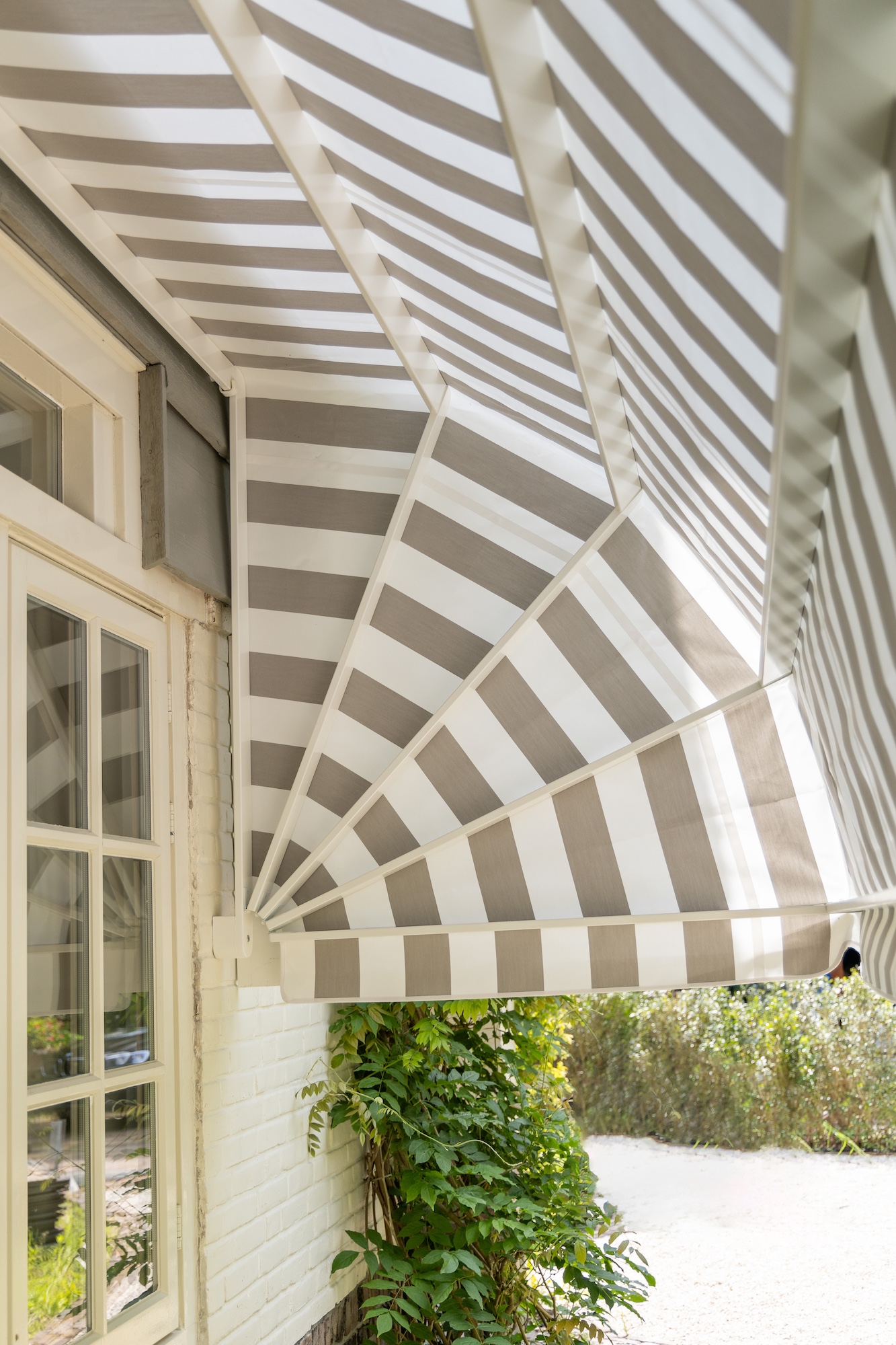 Het doek is minstens zo belangrijk als het frame. In dit project is gekozen voor een doek met door en door gekleurde garens. Hierdoor blijft de kleur jarenlang helder, zelfs bij intensieve blootstelling aan zonlicht. De combinatie van blauw-grijze tinten met witte blokstrepen sluit prachtig aan op het gevelhout en zorgt bovendien voor een lichte, vriendelijke sfeer onder de markies. Binnen blijft het lekker koel, terwijl het daglicht nog voldoende ruimte krijgt.