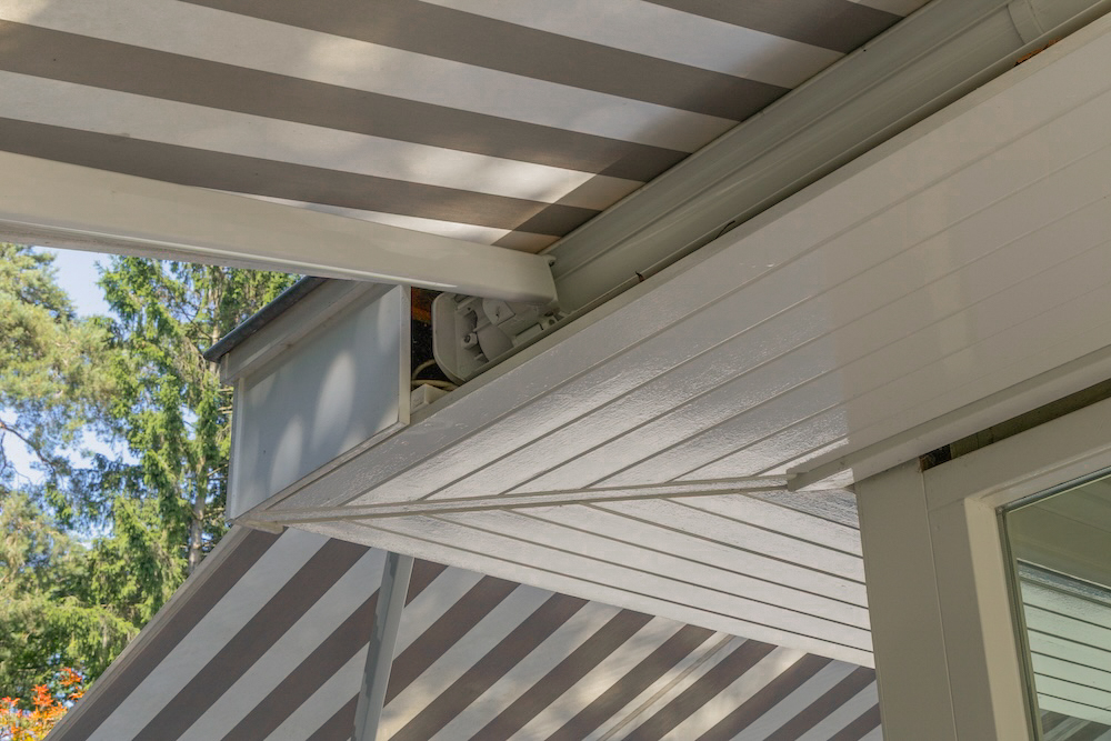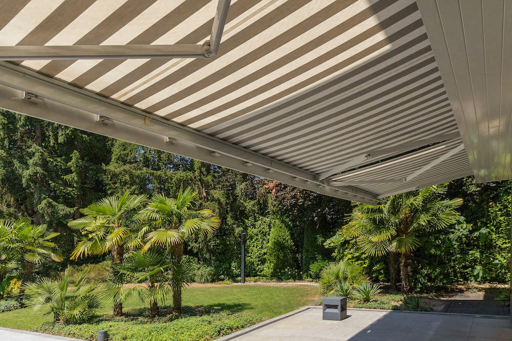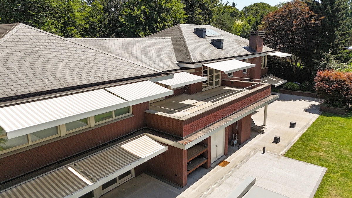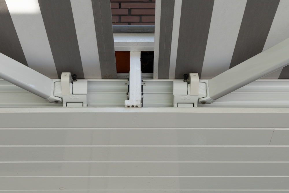 Wat dit project uniek maakt, is de manier waarop de zonneschermen in de woning zijn geïntegreerd. De knikarmschermen zijn volledig onzichtbaar als ze zijn ingetrokken. Ze worden netjes opgeborgen achter de speciaal ontworpen boeidelen, waardoor de villa zijn klassieke en tijdloze uitstraling behoudt. Dit is een vorm van zonwering op maat die perfect past bij een woning waar esthetiek een belangrijke rol speelt.