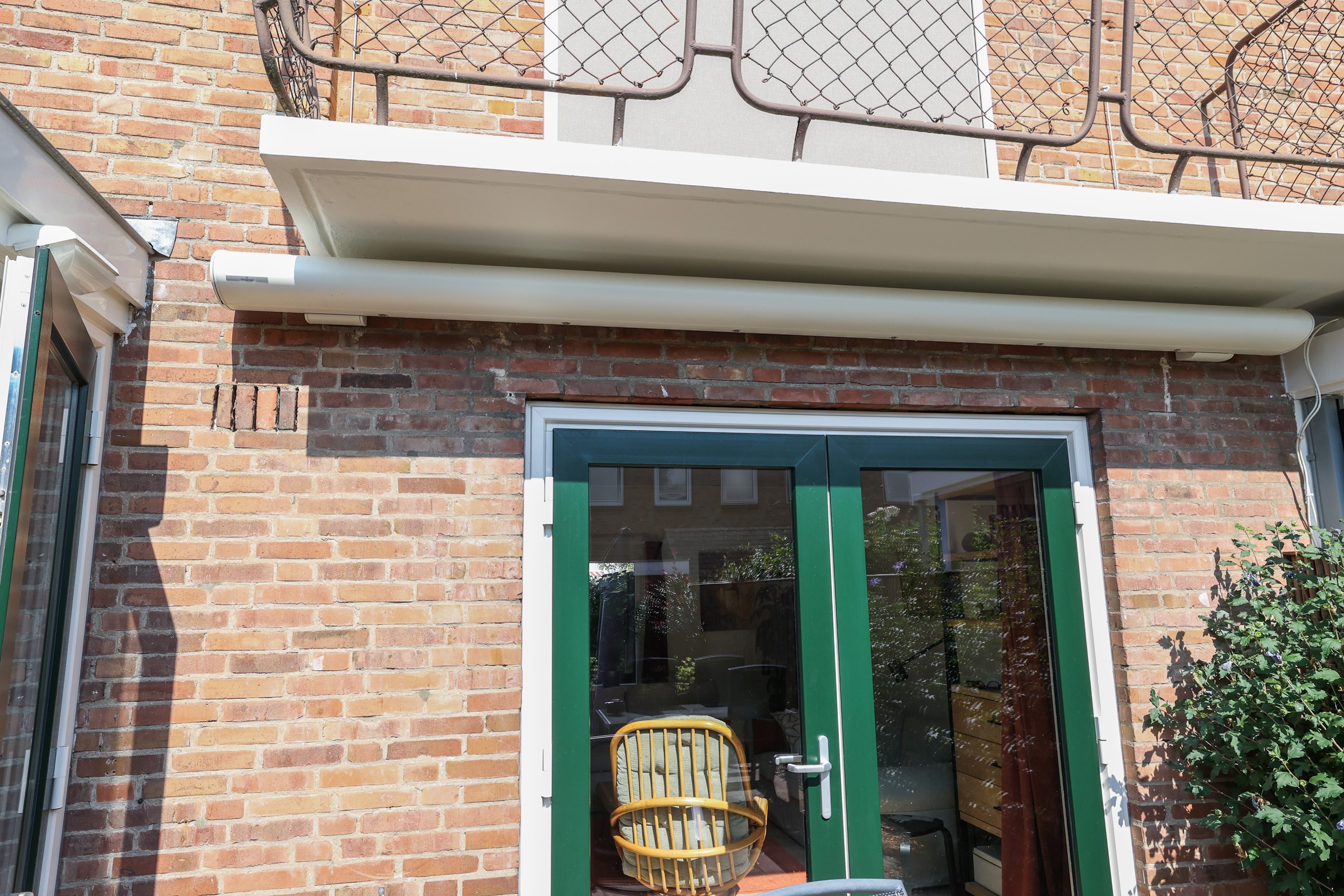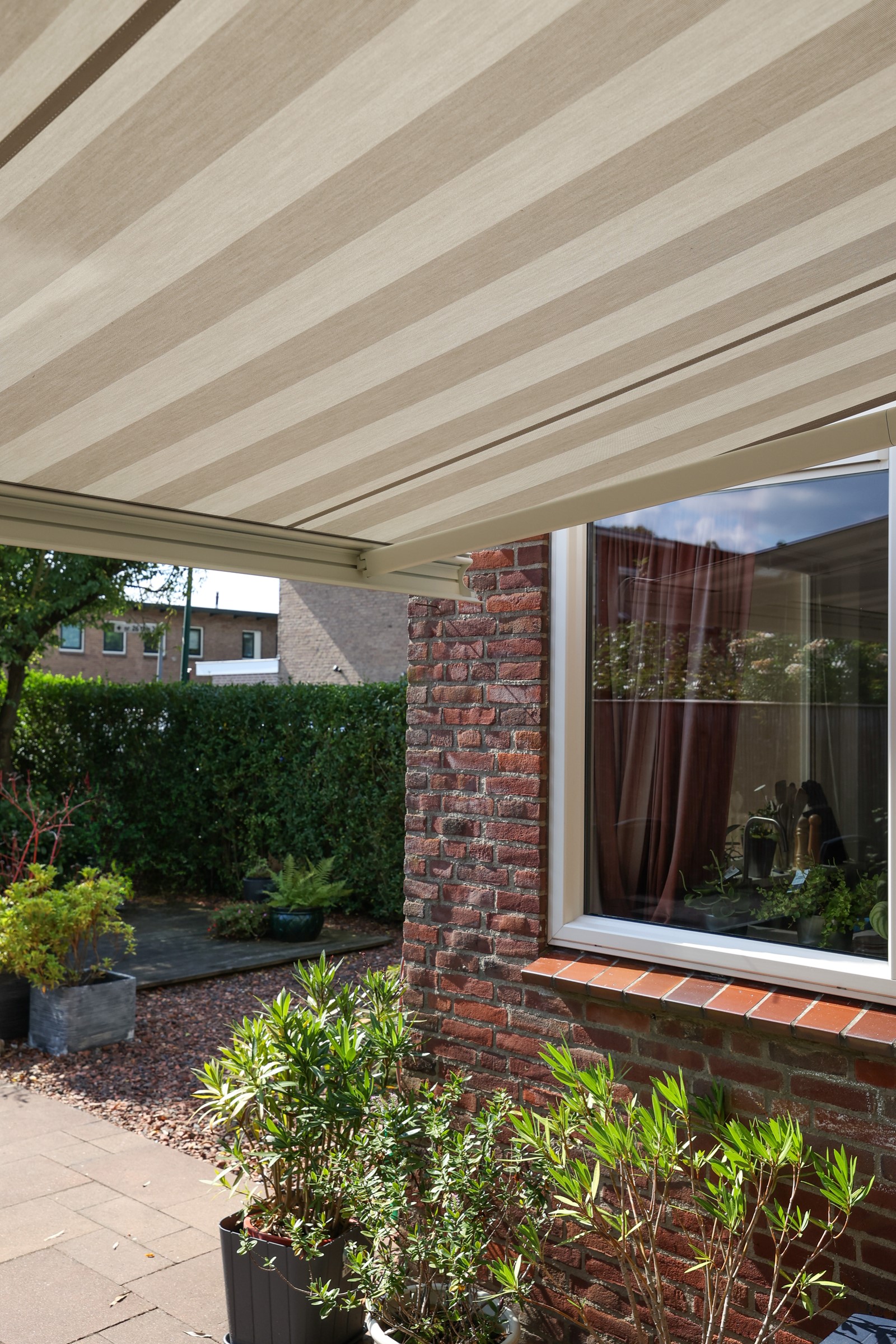 Het elektrisch bedienbare zonnescherm is niet zomaar een knikarmscherm. Met een breedte van vijf meter en geïntegreerde ledverlichting onder de cassette is dit een echte eyecatcher in de tuin van de woning in Eemnes. Dankzij de verlichting kunnen de bewoners ook in de avonduren comfortabel en sfeervol buiten zitten. Dit type terraszonwering combineert gebruiksgemak, sfeer en bescherming tegen de zon in één stijlvol geheel.