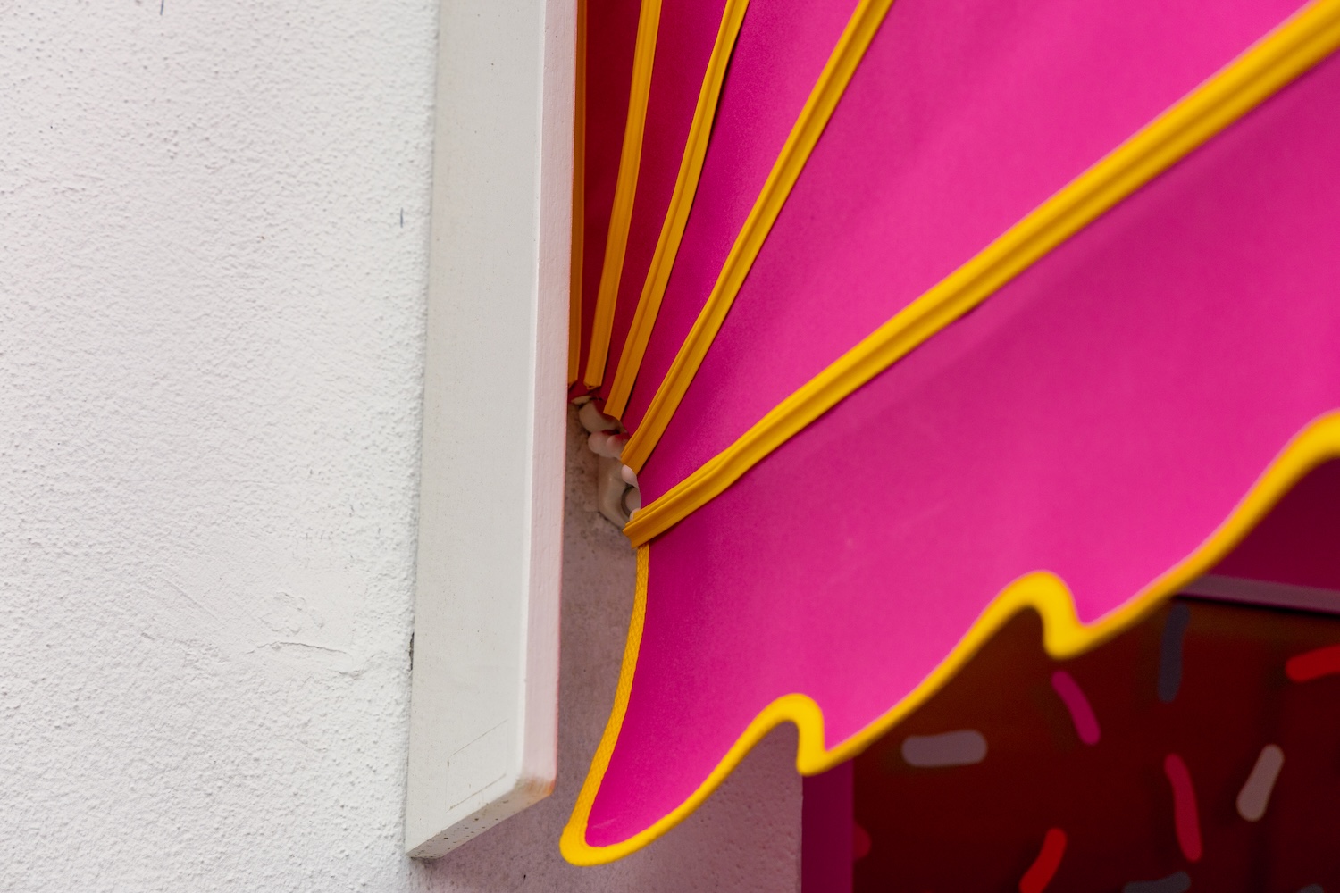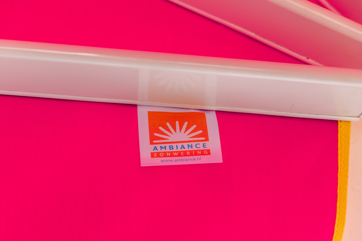 De markies in Loosdrecht is uitgevoerd in frisse, zomerse kleuren die perfect passen bij de vrolijke sfeer van de ijssalon. De roze tint zorgt voor een warme, uitnodigende uitstraling, terwijl het geheel mooi aansluit bij de kleur van de kozijnen en gevel. Hierdoor vormt de markies een harmonieus geheel met het pand, zonder dat het te druk oogt.