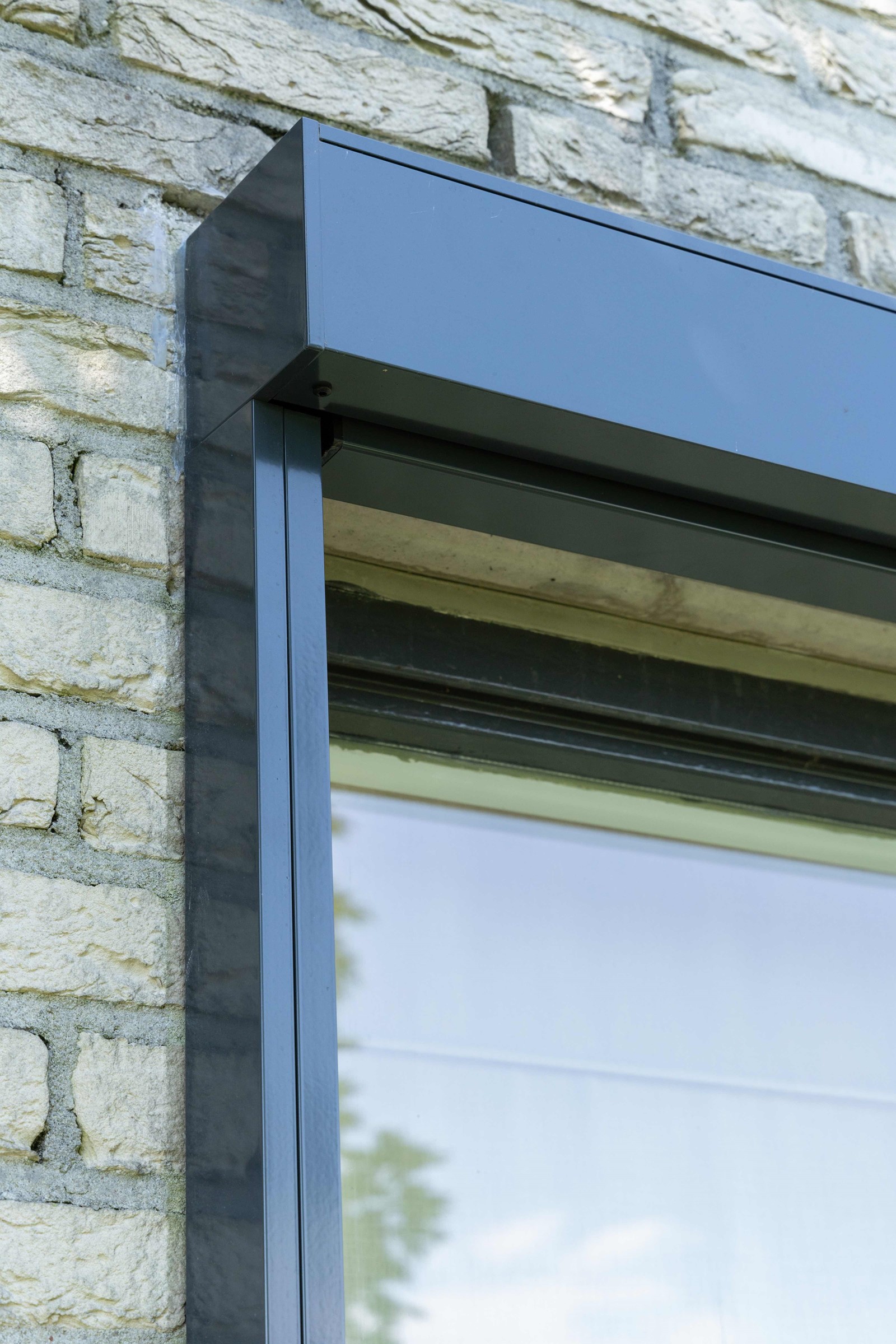 Bij deze woning in Kortenhoef is gekozen voor een slimme combinatie van kleurgebruik. Op de bovenverdieping is een donkergrijs screendoek toegepast, terwijl het onderste deel juist een lichtere kleur heeft gekregen. Hierdoor sluit de verticale zonwering visueel naadloos aan op het moderne lijnenspel van de gevel. Het resultaat is een subtiel contrast dat tegelijkertijd zorgt voor een rustige en strakke uitstraling.