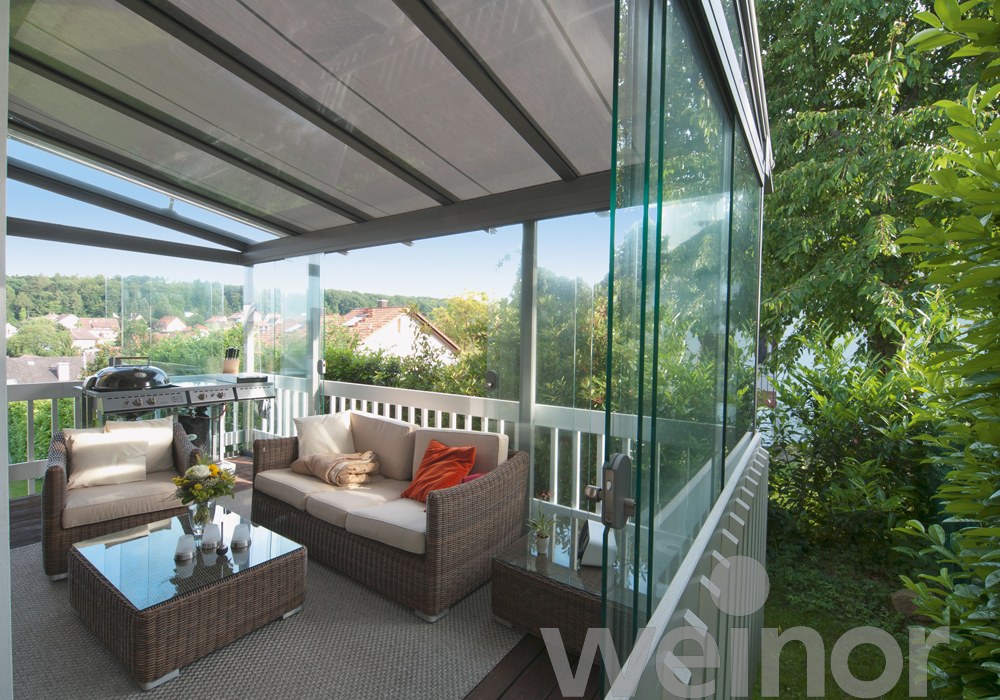 Voor extra beschutting tegen wind en regen kun je de Terrazza Originale uitbreiden met glazen wanden. Zo creëer je een compleet gesloten “Glasoase®” – een weersecht buitenverblijf